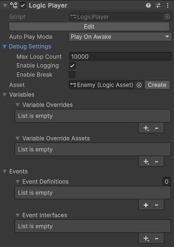 In the Logic Player Inspector, you can view and edit custom events defined in a Logic Asset set in Asset.